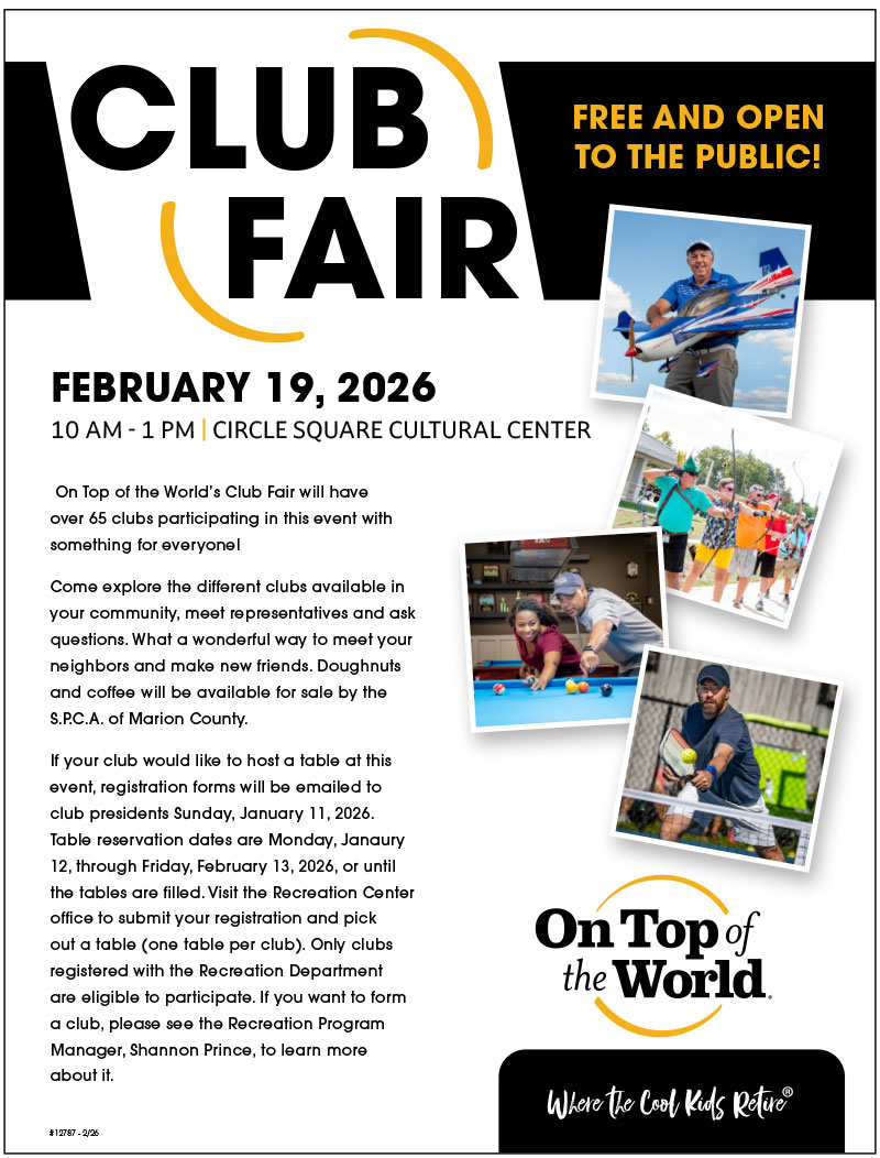 On Top of the World Communities is Where The Cool Kids Retire. We offer our residents an endless stream of concerts, dances, parties, theatre, get-togethers, happy hours as well as more than 200 resident clubs, and social and service organizations to get involved with.