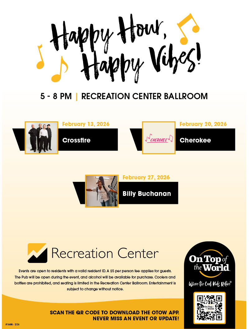 On Top of the World Communities is Where The Cool Kids Retire. We offer our residents an endless stream of concerts, dances, parties, theatre, get-togethers, happy hours as well as more than 200 resident clubs, and social and service organizations to get involved with.