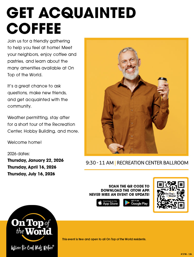 On Top of the World Communities is Where The Cool Kids Retire. We offer our residents an endless stream of concerts, dances, parties, theatre, get-togethers, happy hours as well as more than 200 resident clubs, and social and service organizations to get involved with.
