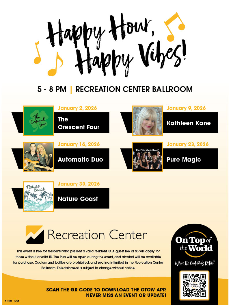 On Top of the World Communities is Where The Cool Kids Retire. We offer our residents an endless stream of concerts, dances, parties, theatre, get-togethers, happy hours as well as more than 200 resident clubs, and social and service organizations to get involved with.