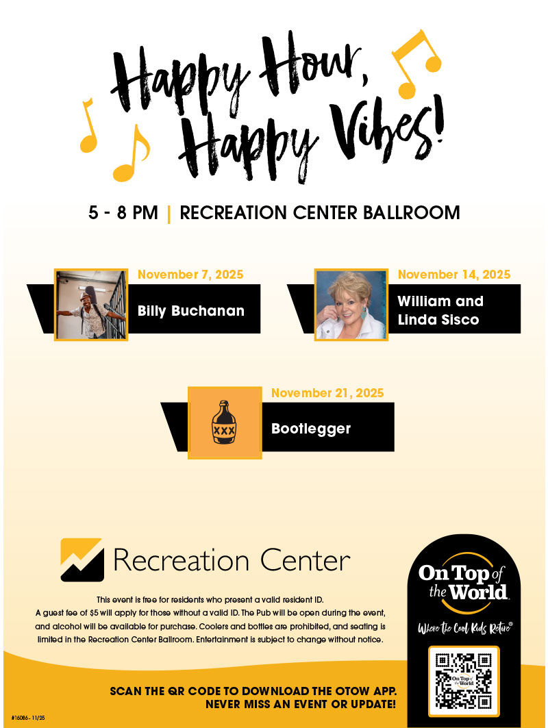 On Top of the World Communities is Where The Cool Kids Retire. We offer our residents an endless stream of concerts, dances, parties, theatre, get-togethers, happy hours as well as more than 200 resident clubs, and social and service organizations to get involved with.