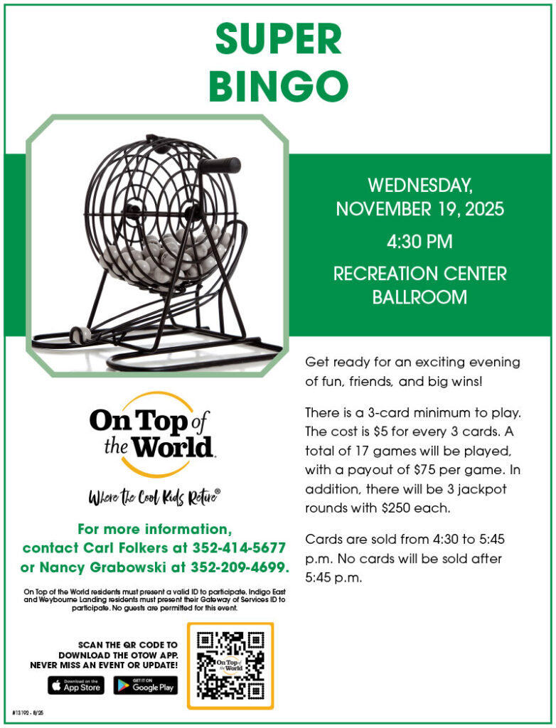 On Top of the World Communities is Where The Cool Kids Retire. We offer our residents an endless stream of concerts, dances, parties, theatre, get-togethers, happy hours as well as more than 200 resident clubs, and social and service organizations to get involved with.